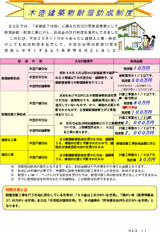11月1日から、足立区の耐震助成制度が変更されました。 10月27日に登録診断士向けの説明会があり、即変更実施ということです。これまでとは大きく変更された部分もあります。 足立区で発行しているパンプは以下のものです。