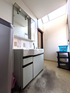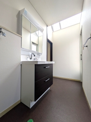 洗面化粧台を交換し、床クッションフロアを貼替ました