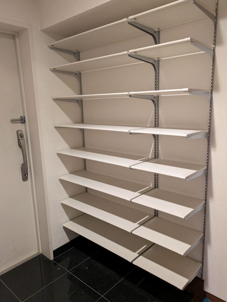 玄関収納を通気性の良い可動式棚に交換し、壁クロスを貼替ました