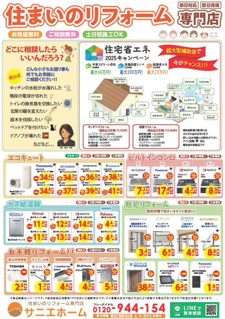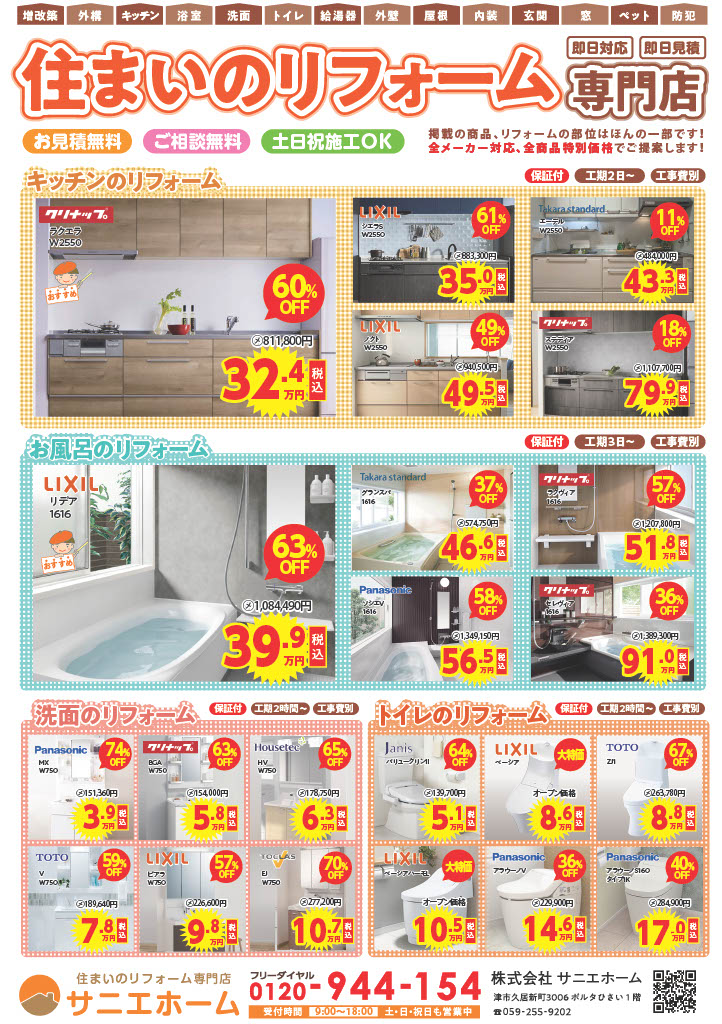 掲載の商品、リフォームの部位はほんの一部です。 全メーカー対応、全商品特別価格でご提案します。 そうぞお気軽にご相談ください。