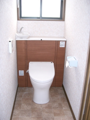 古くなった便器をリニューアル、収納付きのシステムトイレなので、掃除用具やペーパーなどスッキリと収納。