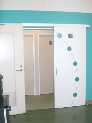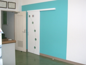 店舗内に隣接するため、そこがトイレスペースと一目でわかるものでありながら、さわやかなイメージカラーと扉のデザインをアクセントとしました。