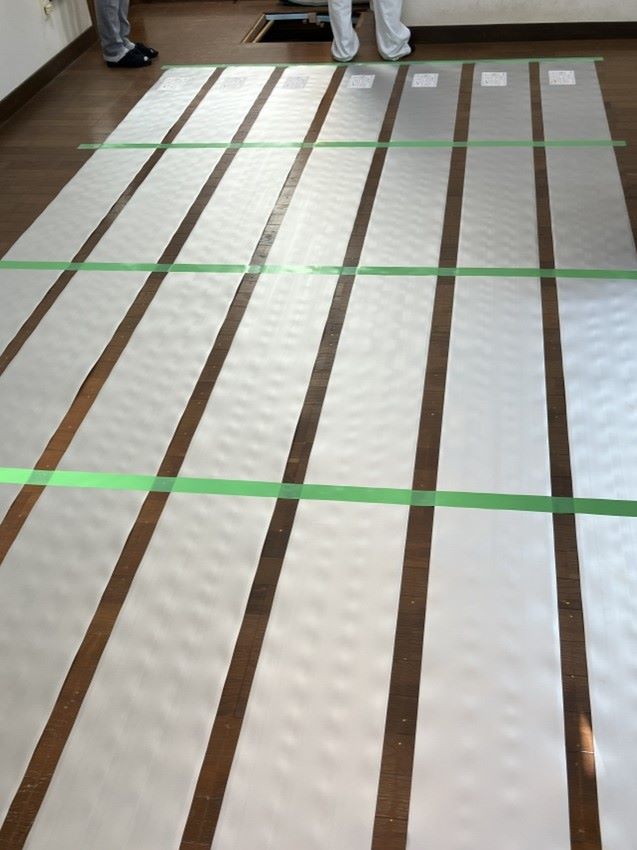床暖房のシートを並べた所です。養生テープで位置決めをしていきます。