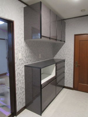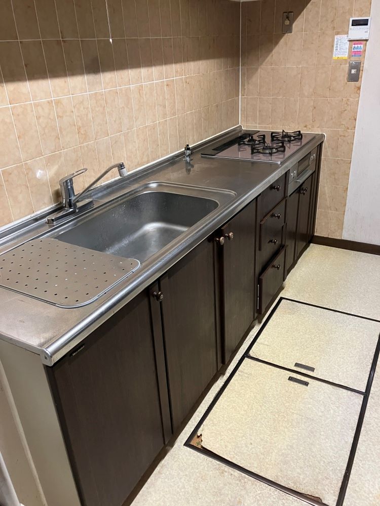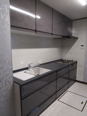 キッチン改修工事を行いました。システムキッチンの入替に加え、木製の食器棚をシステム収納に。またキッチンの内装も一新しています。