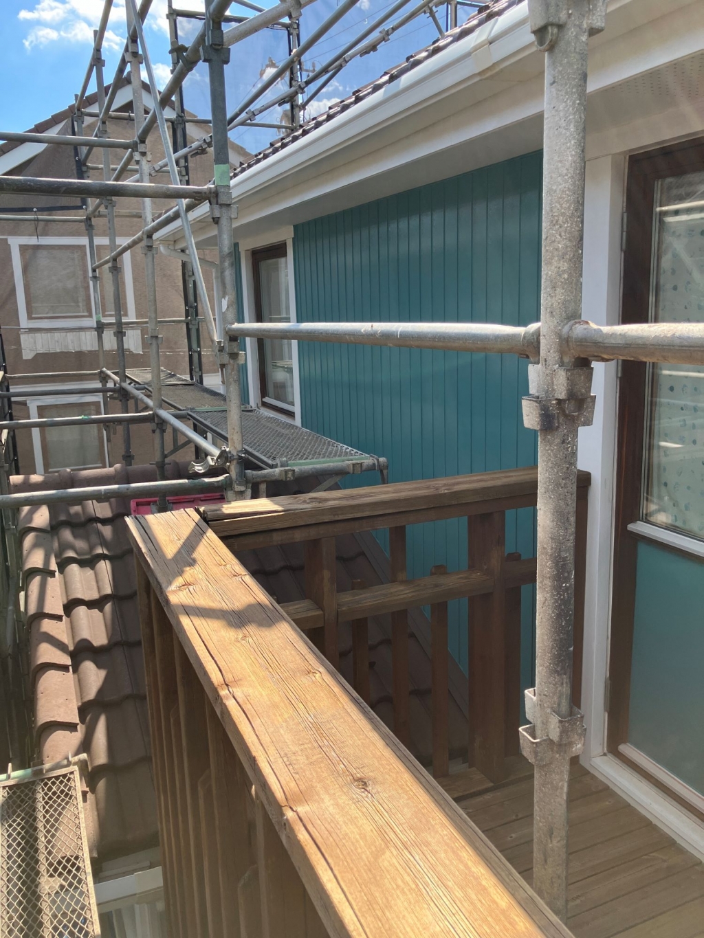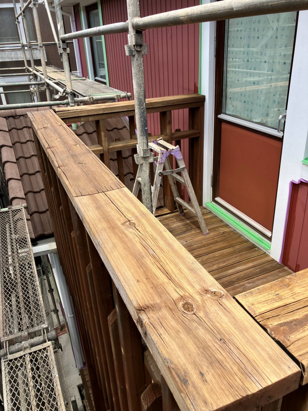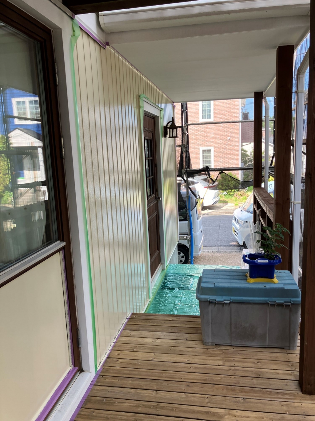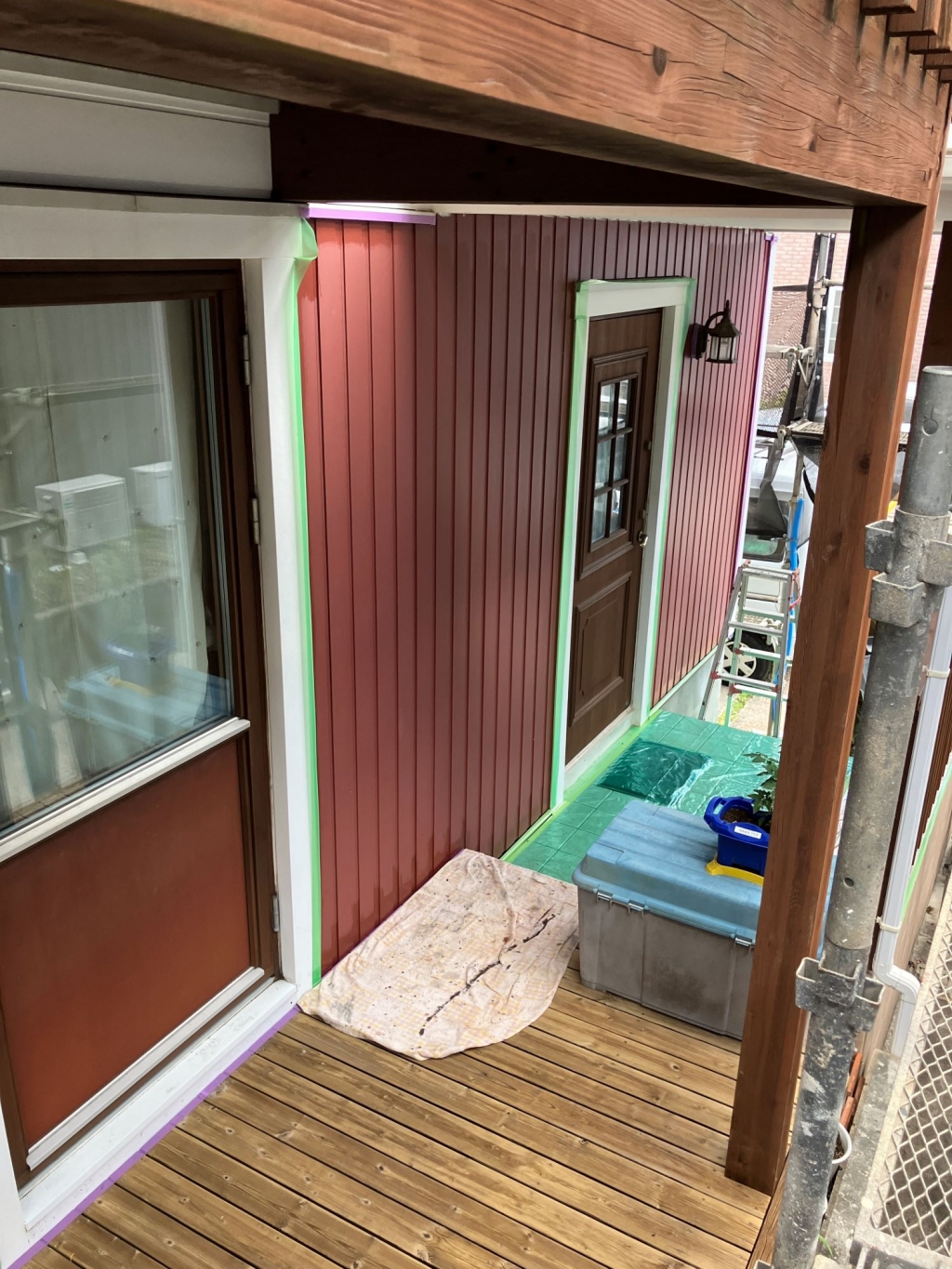 外壁塗装前にサッシ廻りなどに養生をしています。1階のデッキ廻りです。