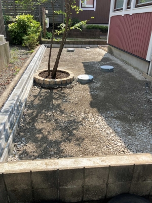 庭のシンボルツリー廻りを囲っています。芝は撤去し、この後コンクリートを敷設します。