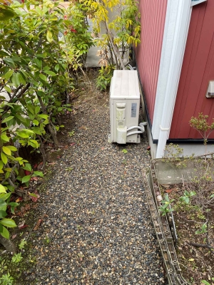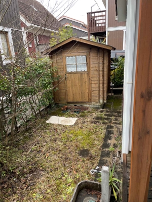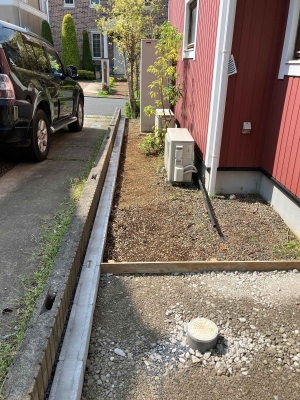 庭はシンボルツリーを残し、芝生や生垣などを撤去し、土間コンクリート打ちをして物置を設置。その他隣地との境界に排水桝を設けています。