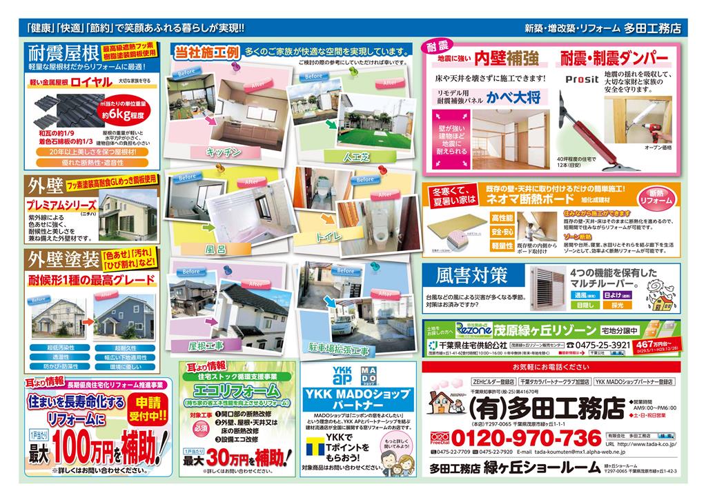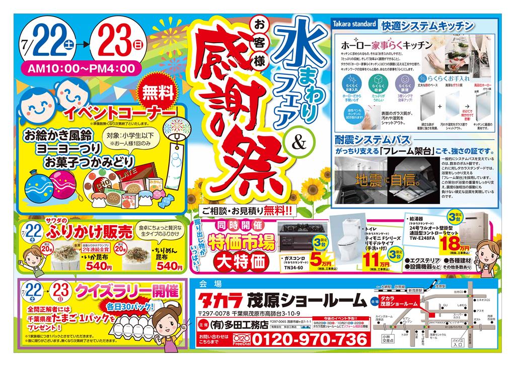 2017年7月22日(土)~23日(日) 展示会を開催いたします! リフォームの相談などお気軽にどうぞ♪ クイズラリー、お絵かき風鈴、 ヨーヨー釣り、お菓子つかみ取り 大人気ふりかけ販売 など 各種イベントもご用意しております。 お気軽にお越しください! ※チラシの表面です。