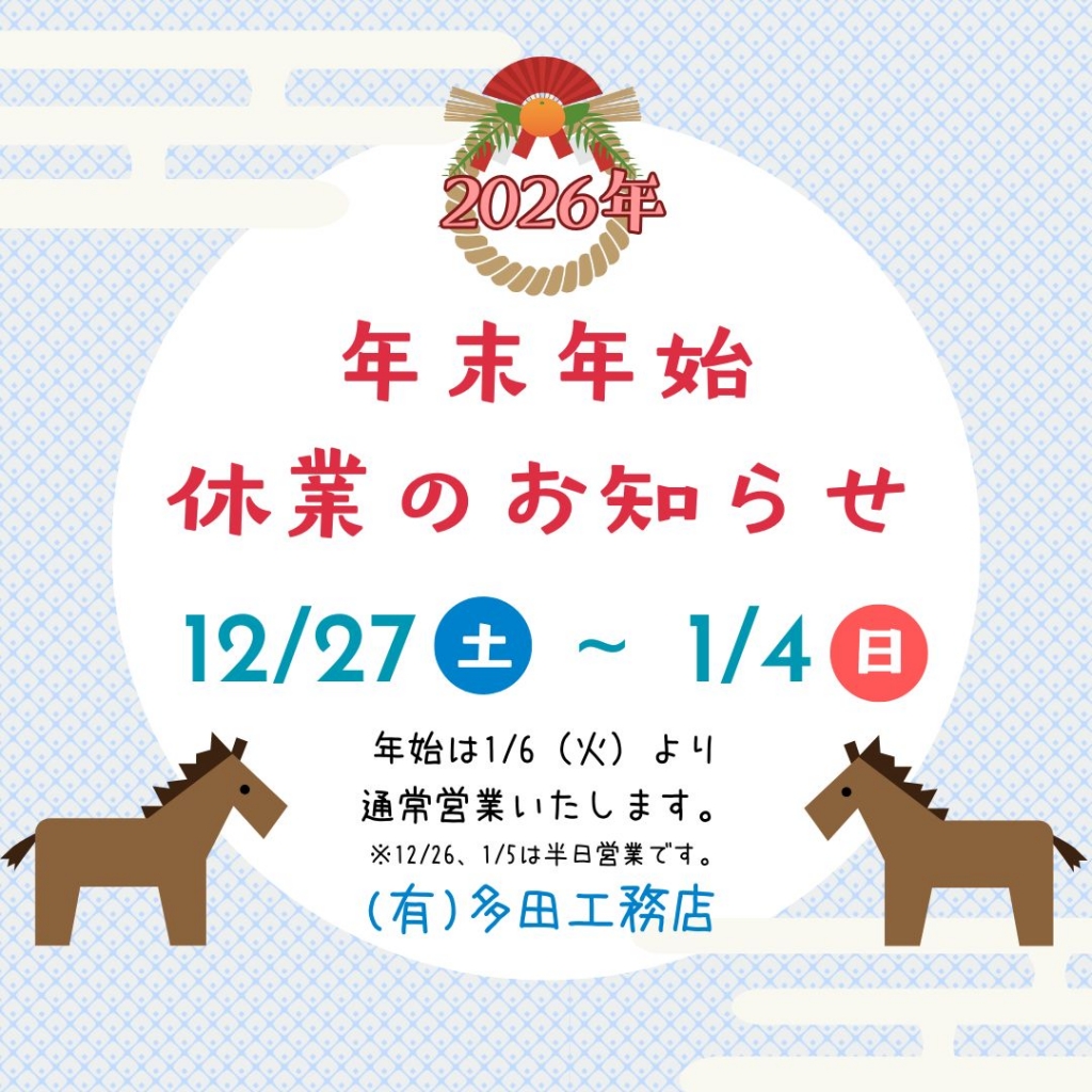 年末年始休業のお知らせです。 今年は12月27日(土)より、1月4日(日)まで休業とさせていただきます。 12/26、1/5は半日営業、通常営業は1月6日(火)よりとなります。 ご迷惑をおかけしますがよろしくお願いいたします。