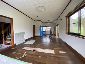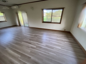 シロアリ被害により、全体的に傷み、床がぶかぶかした状態になっていました。 根太や大引きを部分的に補修し、防蟻工事を併せて実施したうえで、新たに床を張り替えています。 仕上げには清掃性と耐久性に優れた塩ビフロアを採用し、メンテナンスがしやすい床に仕上げました。